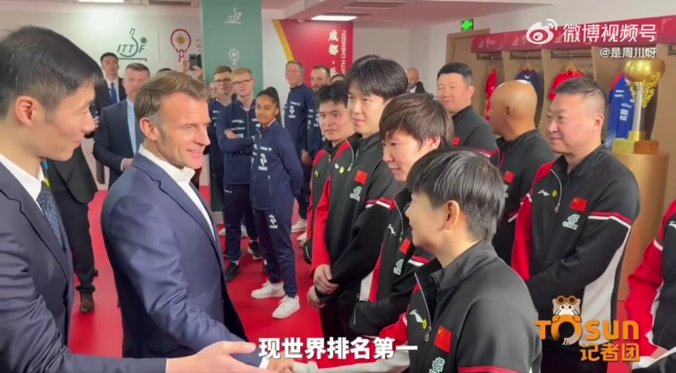 12月6日消息,12月5日下午,法国总统马克龙前往四川省体育馆,看望了2025年成都国际乒联混合团体世界杯法方代表队运动员,并与中国乒协主席王励勤,中方运动员林诗栋,王楚钦,王曼昱,孙颖莎等进行互动。王励勤向马克龙介绍孙颖莎,马克龙称赞她“非常厉害!拿过不少世界冠军!”