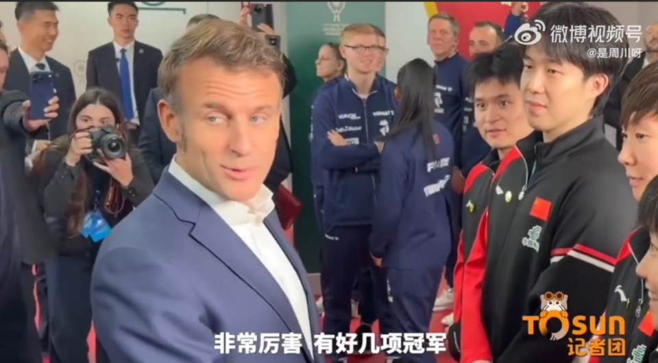 马克龙和王楚钦、林诗栋、孙颖莎、王曼昱等人进行了热情交流。