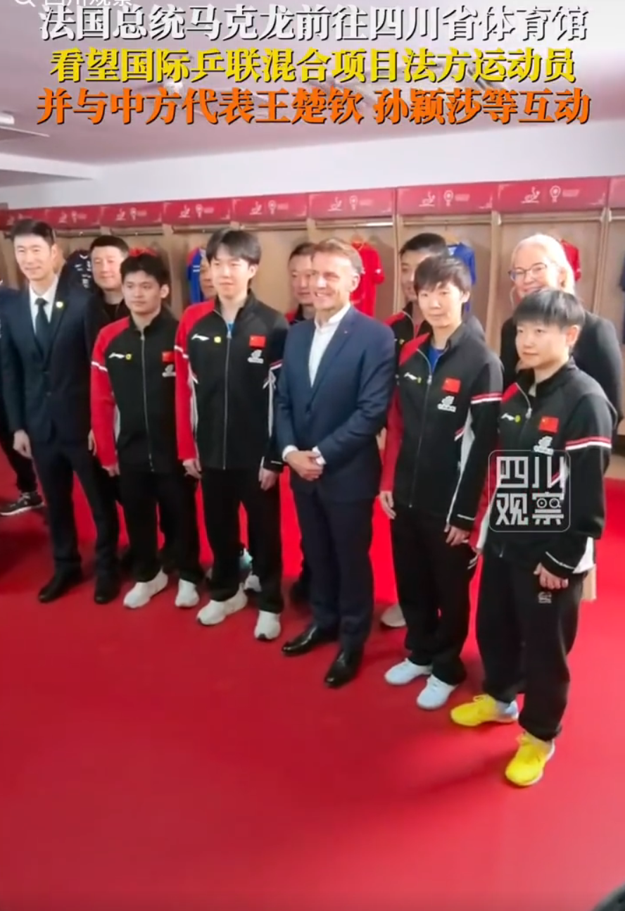 12月5日,正在中国访问的法国总统马克龙来到了四川省体育馆看望法国队队员们,他也顺带着接见了中国乒乓球队的全体队员、教练。