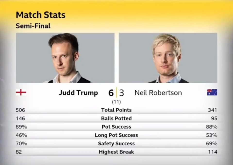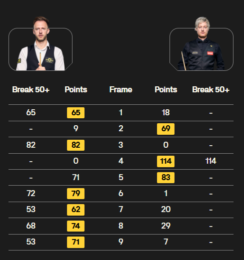 第9局,罗伯逊红球失误,特鲁姆普再度上手,一杆53分锁定胜利,连赢4局,6-3淘汰罗伯逊。