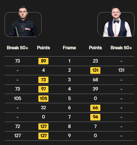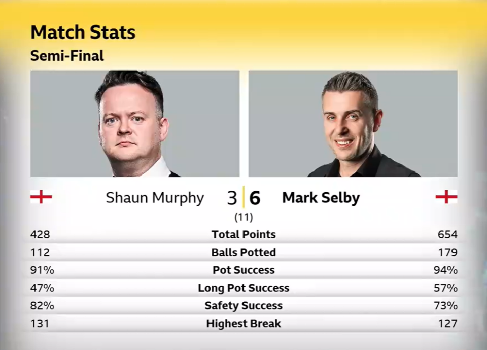 凌晨时段,第二场半决赛,马克·塞尔比对阵肖恩·墨菲。前四局,墨菲第2局打出一杆破百,但第3局,打丢超分球,被塞大师一杆清台逆转。塞大师,在第1局和第4局打出两杆70+,3-1领先。