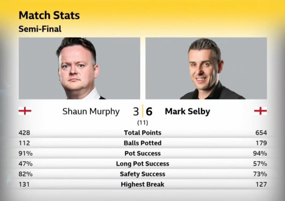 局休回来,塞尔比再胜一局,墨菲奋力扳回两城,马克·塞尔比凭借单杆致胜,回敬一波两连击,锁定胜利,以6-3力压肖恩·墨菲,晋级决赛。
