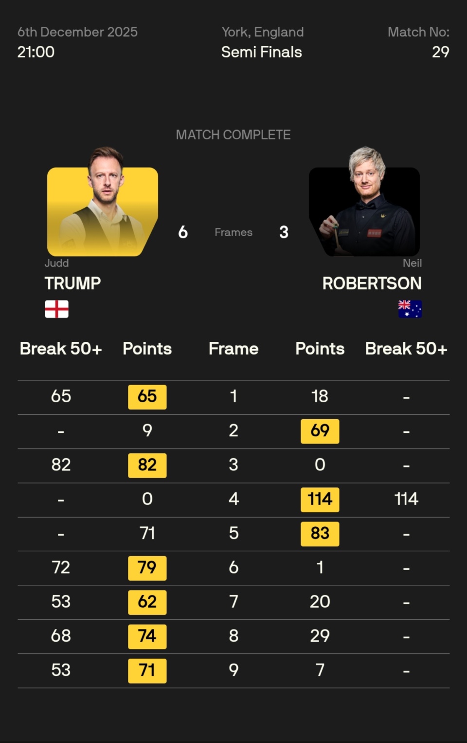 第五局耗时近50分钟的防守大战,两人战至最后一颗黑球,罗伯逊翻袋攻进黑球,3-2领先特鲁姆普,接着特鲁姆普单杆致胜,连胜四局,特鲁姆普在2-3落后罗伯逊的情况下,完成逆转,以6-3战胜罗伯逊,背靠背连续两年晋级决赛,力争卫冕。
