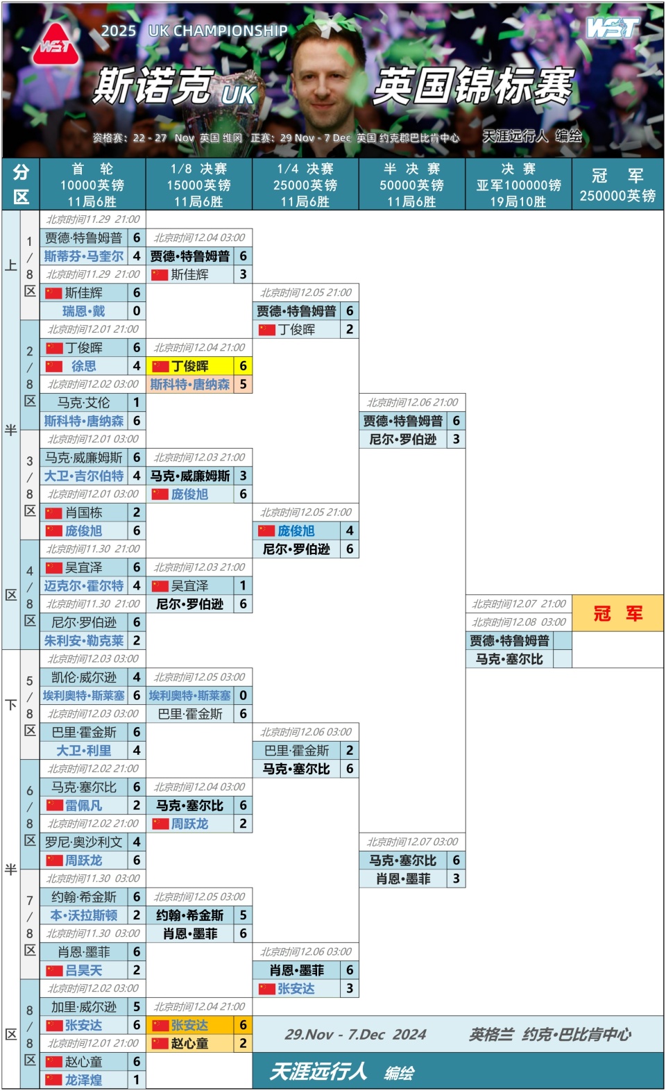 最新2025斯诺克英国锦标赛正赛进程签表,一张表格看英锦赛正赛全程的赛程战报,请转发收藏,以备不时之需;各位看官老师看看,小编做的这个签表,能称得上全网第二吗?