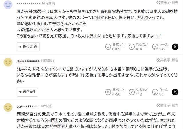 而被点赞最高的一条留言是:“张本选手过去确实一直承受着部分日本网友的恶意中伤。但无论从对体育的热忱,还是日常的言行举止来看,他都是一位拥有日本精神、货真价实的日本人。我相信,有很多人和我一样,怀着这样的心情关注并支持着他!”