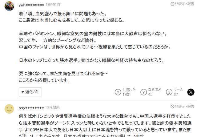 有日本球迷呼吁日本有关方面为张本智和提供心理保护:“张本真的打得很好,很有激情。换作是我,恐怕早就情绪崩溃了。中国选手(面对压力)通常只能沉默不语,但反过来想想,那种一句话都不能说的中国选手心理真的没问题吗?希望日本乒乓球协会和日本奥委会都能切实为张本兄妹做好心理支持。”