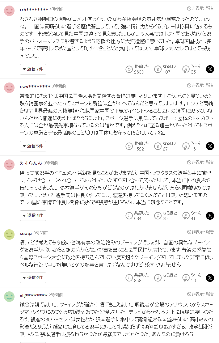 在混团决赛结束后,日本球迷引发了热议,有日本球迷写道:我认为国际大赛上念错名字、巨大嘘声都应该写信询问国际乒联,成都是否有继续举办国际大赛的资格。