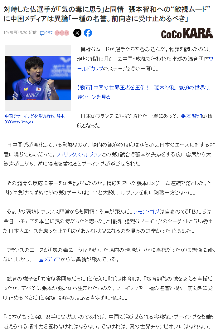 文中写道:异样的气氛吞没了张本智和,张本智和在对阵法国队的比赛中成为众矢之的,现场观众充满了对日乒王牌的敌意,张本智和对阵费利克斯-勒布伦的比赛明显被巨大的噪音所干扰无法集中精神,最终被3-0横扫。就连中国媒体都认为这样的噪音超出了比赛的范畴,但因为张本智和是世界最顶级的强者,他受到的关注会更大。