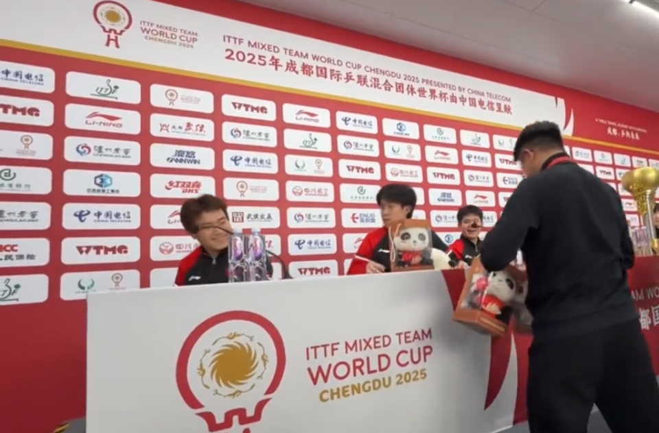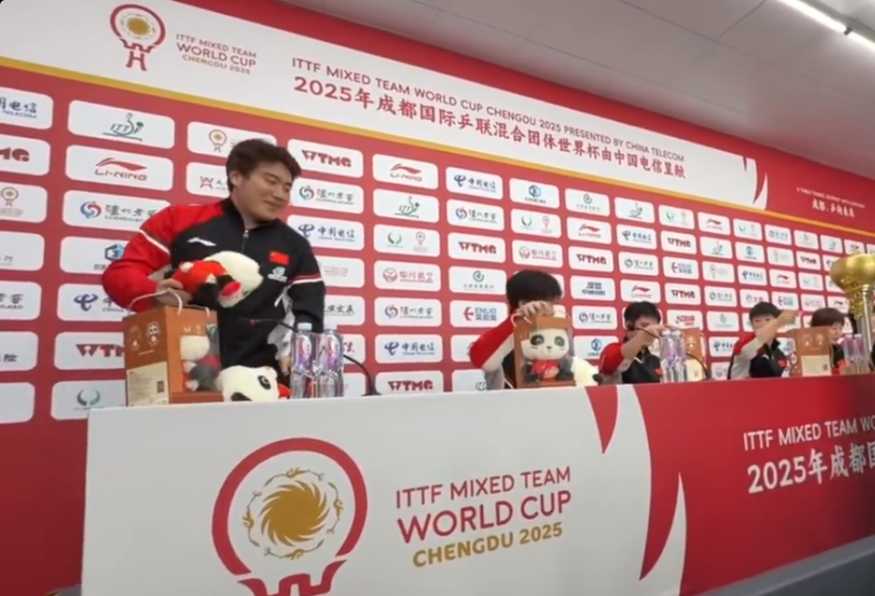 12月8日消息,在12月7日晚上举行的2025国际乒联混合团体世界杯决赛中,中国队8-1击败日本队,蝉联冠军。赛后发布会上,队员们带走吉祥物熊猫,梁靖崑拿走了王楚钦的一个熊猫,表示自己家里人多,把王楚钦逼得直接吐槽:“你道德绑架我!”