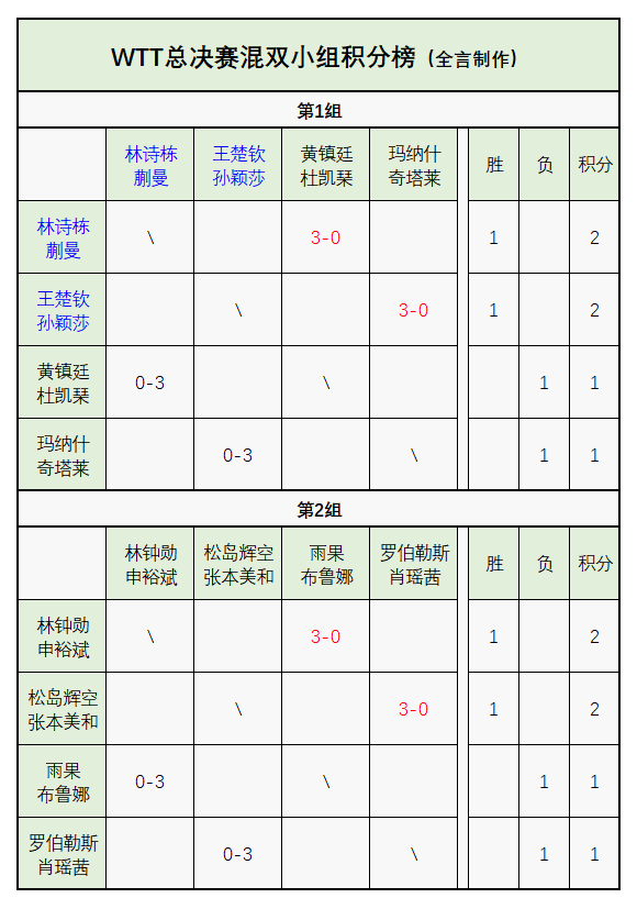混双:松岛辉空/张本美和(日本)3-0罗伯勒斯/肖瑶茜(西班牙)、林钟勋/申裕斌(韩国)3-0雨果/布鲁娜(巴西)。