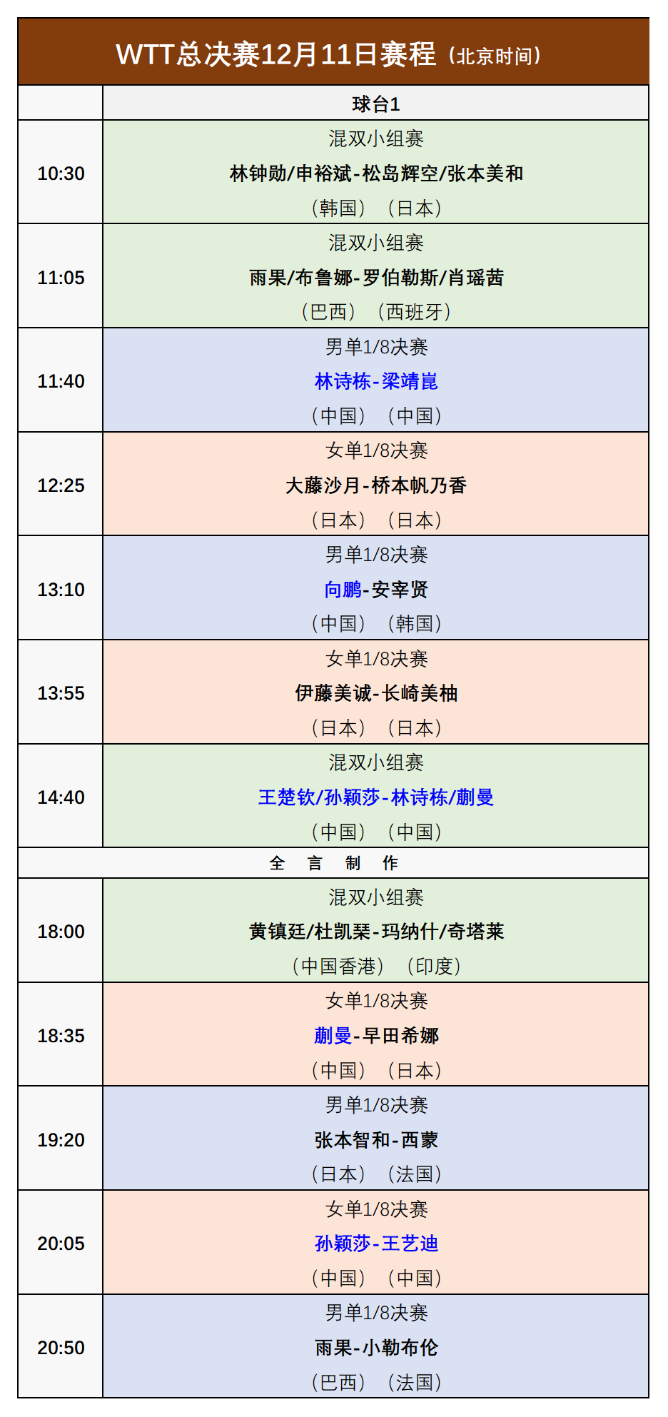 12月11日晚,单打将结束首轮对决,混双也将结束第二轮的较量,具体赛程如下: