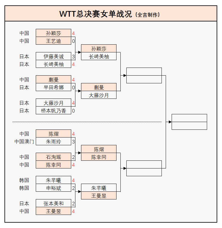 本届比赛国乒总计11位运动员参加单打,目前内战3人出局但都是不敌队友,其中梁靖崑0-4输林诗栋、王艺迪0-4输孙颖莎、石洵瑶2-4输陈幸同,王楚钦、向鹏、王曼昱、蒯曼、陈熠外战过关;混双王楚钦/孙颖莎连赢2场,林诗栋/蒯曼也只在内战中0-3输“莎头”组合。