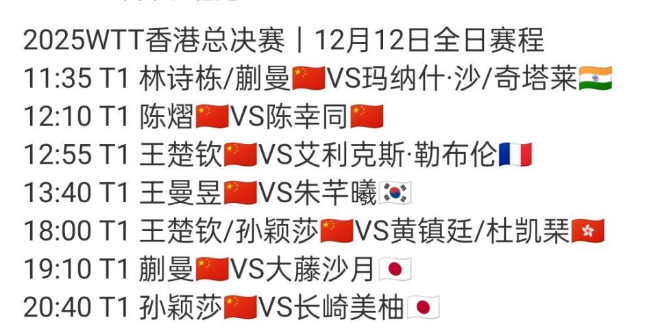 按照赛程,12月12日国乒五场单打比赛,外战王楚钦vs艾利克斯.勒布伦(法国),王楚钦占据明显优势,但也不可掉以轻心,需要把遭遇困难的准备做足,王曼昱对阵朱芊曦(韩国),发挥正常水平就是稳赢,蒯曼vs大藤沙月(日本),蒯曼打大藤沙月有一套,这次估计又是4-0轻松获胜。
