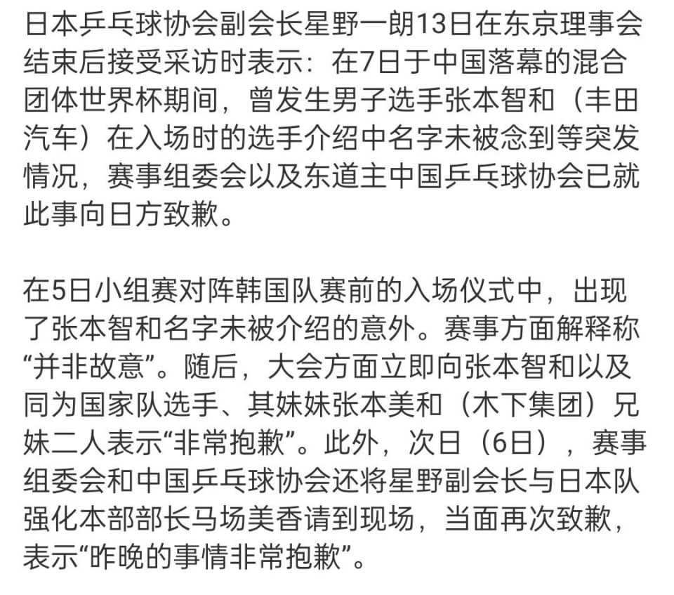 日本乒协介绍,在意外发生后的第一时间,就跟各方负责人提出抗议,面对这些突发情况,国乒已就此事给出答复,表达了非常抱歉的意思,后来赛事组委会和中国乒协还特意请星野一朗、马场美香来到现场,当面再次致歉,表示对张本智和遇到的这些事情,感到很失礼特别不好意思。