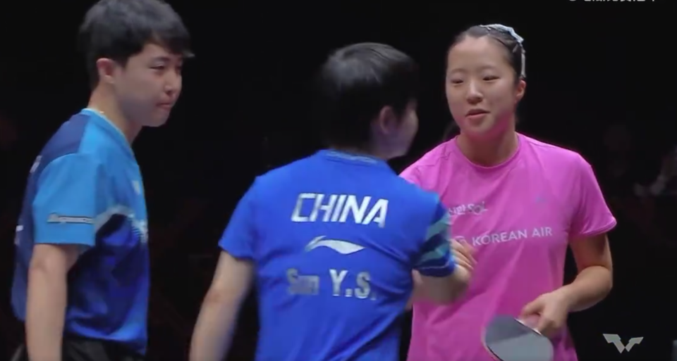 随后,韩国组合与孙颖莎、王楚钦握手致意,申裕斌拍了拍莎莎的肩膀,主动关心孙颖莎的伤情,