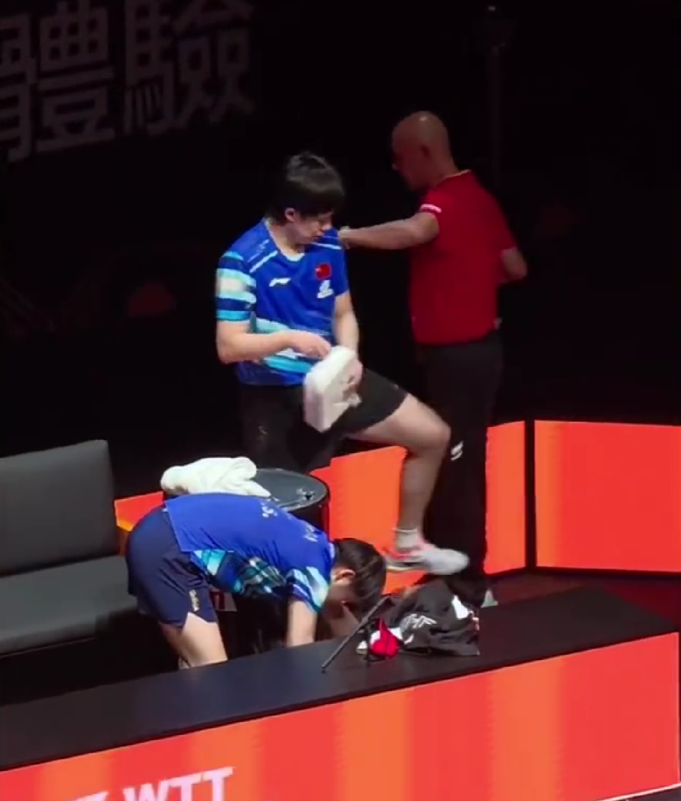 孙颖莎在当天与蒯曼的女单半决赛中因左脚踝扭伤退赛,第三局交叉步救球时疼痛加剧,仅仅休整80分钟后带伤出战混双决赛。赛前王楚钦多次叮嘱她“保护好腿”,尤其担忧她因救球习惯加重伤势。