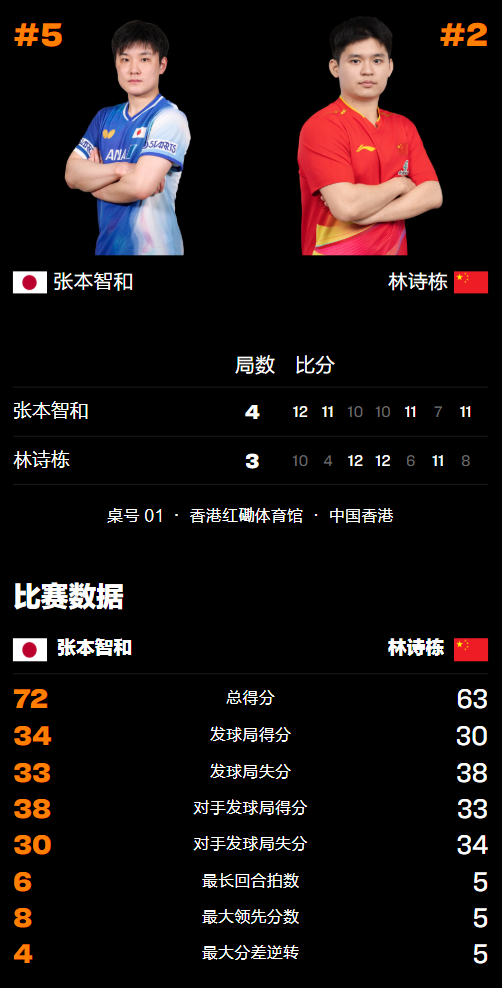 比赛开始后,林诗栋开局不利数次落后比分,随后张本智和因为发球违例被判罚,于是申请鹰眼挑战结果失败战至3-3平,紧接着林诗栋3-4再次落后连得3分逆转,后半段以9-5拉开差距,10-7拿到局点后连丢3分战成平手,随后再输2球以10-12落败,输得非常可惜。