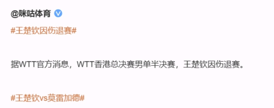 12月14日,WTT香港总决赛男单半决赛传来消息,世界排名第一的中国选手王楚钦因伤退赛,瑞典名将莫雷加德自动晋级决赛,将与日本选手张本智和争夺冠军头衔 。