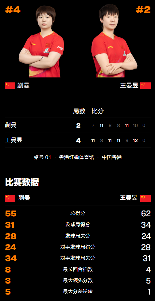第二局前半段王曼昱依旧掌握主动权,很快便6-1、8-3领先蒯曼,但后半段被蒯曼的加速进攻打乱战至8-8平,紧接着再输3分以8-11落败,双方由此而回到同一起跑线。