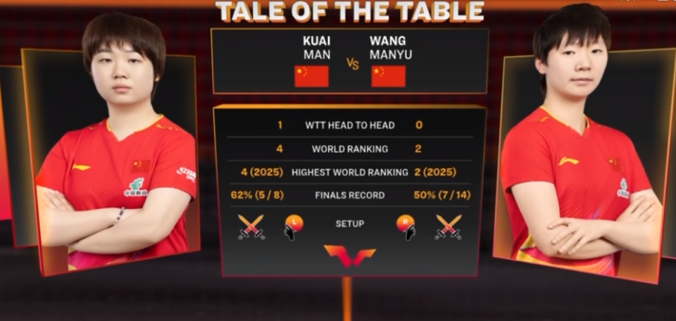 在之前结束的WTT香港总决赛女单决赛上,国乒女队的两位选手王曼昱和蒯曼相遇了。在之前的一场半决赛上,由于孙颖莎因伤无法坚持,所以她选择了退赛,而蒯曼就直接晋级。在另外一场半决赛上,王曼昱击败了队友陈熠。从世界排名上来看,王曼昱排在第二位,要稍稍高于蒯曼。但是,从过往的战绩上来看,蒯曼是占据优势的。故,本场比赛的结果在赛前真不好说。