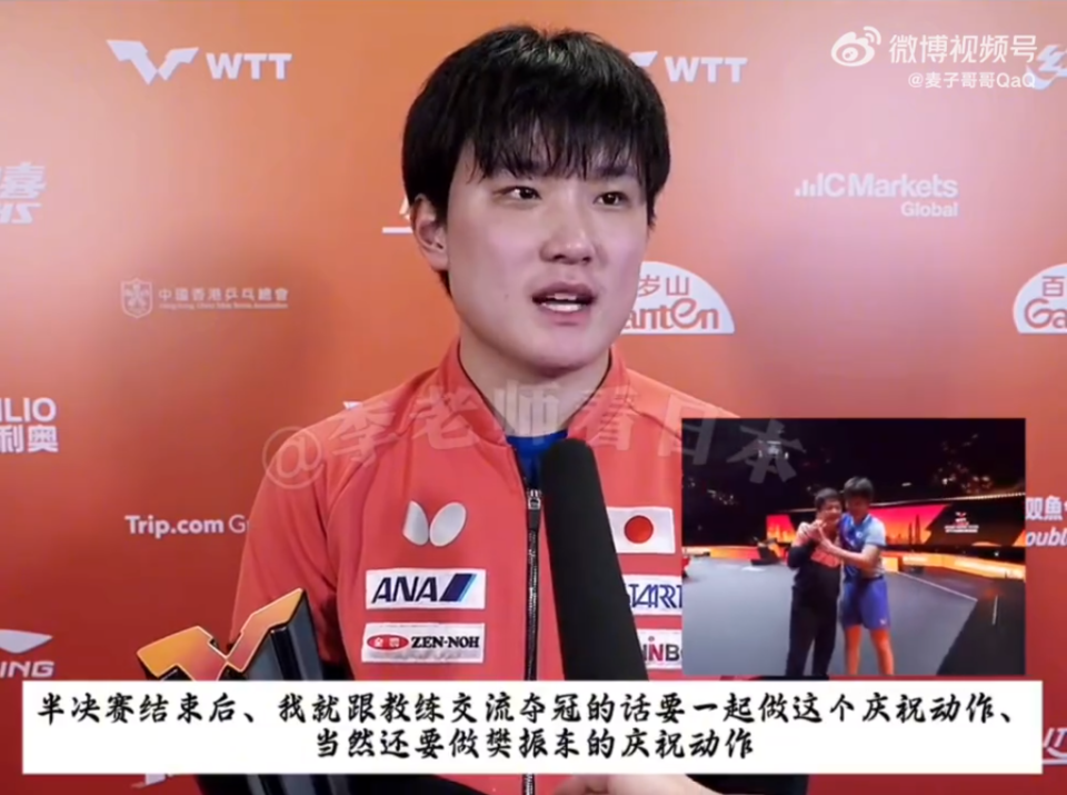 张本智和表示:“今天是岸川教练儿子6岁的生日,我昨天才知道这件事,心中倍感压力。即便赢了半决赛,如果决赛没赢,也构不成祝贺。半决赛结束之后我跟教练交流,如果决赛夺冠一定要做这个庆祝动作,能兑现承诺还是挺开心的,衷心表达了我的祝贺之情。”