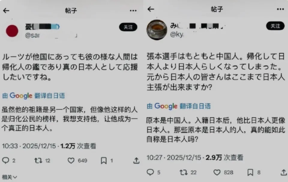 对此,有博主怒斥道:“张本智和公开支持高市早苗的言论应该被广为传播,有中国籍的球迷为他辩白:‘张本智和是日本人可以有日本人的立场’,那么同样的话代入不同的人,‘高市早苗是日本人可以有日本人的立场’,你觉得合适吗?很明显这就是严重的挑衅。”