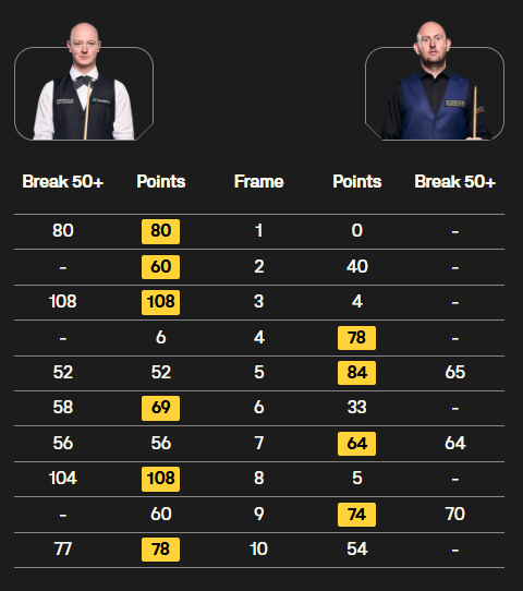 短休后,第5局,韦克林一杆52分被塞尔特一杆65分清台逆转。第6局,韦克林打出一杆漂亮的58分,但随后的安全球出现严重失误,险些又遭单局逆转。第7局,韦克林单杆56分后,简单黑球失误,结果被塞尔特一杆64分逆转。第8局,韦克林再添一杆破百,5-3到赛点。第9局,韦克林手握60分后失误,又被塞尔特一杆70分清台逆转。第10局,韦克林一杆77分,回敬了一局单局逆转,同时6-4终结比赛。