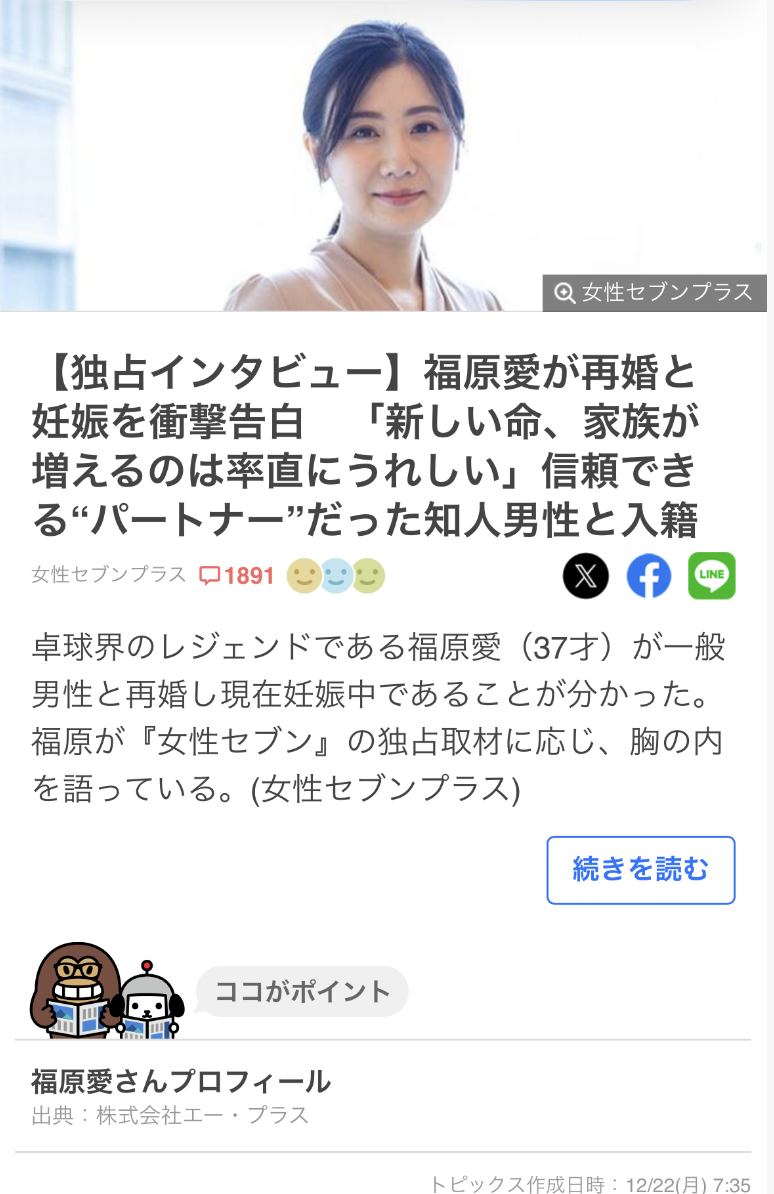 根据《女性7》周刊独家报道、37岁的日乒前著名国手福原爱于2025年7月、与一般男子再婚、现已怀孕。在专访中、福原爱回顾了与江宏杰从结婚到离婚及因孩子监护权而引发的司法事件。对此、福原再次向支持者道歉。福原强调在自己最困难的时候、是该男子支撑自己走了过来。与他的交往是与江宏杰正式离婚之后的事情。