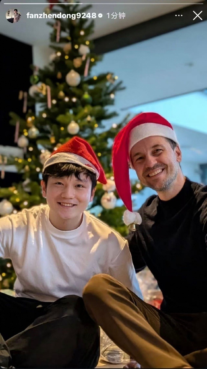 12月25日,樊振东发布和球员波尔的圣诞节合照,两人头戴着圣诞小红帽,笑嘻嘻地蹲坐在圣诞树前,画面格外温暖。