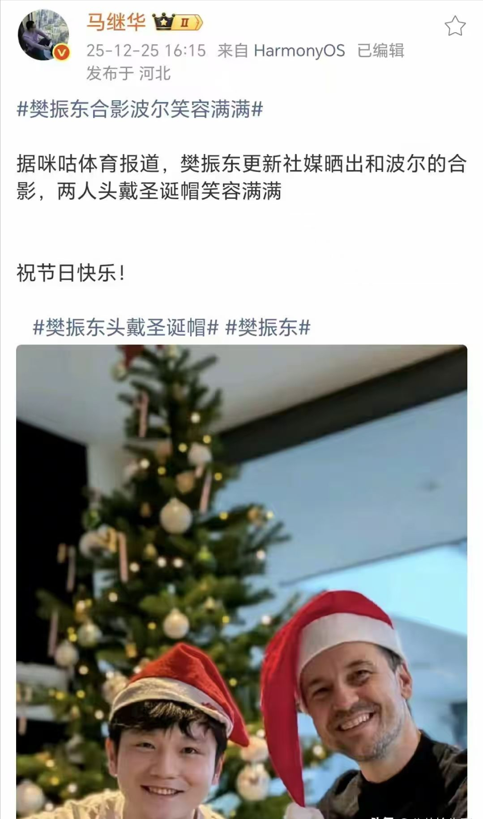 2025年的圣诞夜,正在德国征战德甲的樊振东,应乒坛传奇波尔之邀,在对方家中聚会,两人头戴红色圣诞帽、站在挂满礼物的圣诞树下的合影,本该成为体坛跨国友谊的佳话,这份纯粹的体育情谊,本该让所有关注乒乓的人感到温暖。