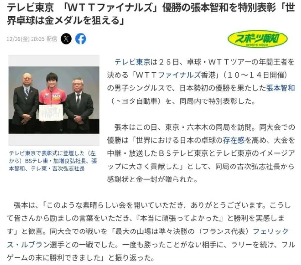 临近年底,此前在香港总决赛斩获男单冠军的张本智和迎来了属于自己的收获时刻。这次他受邀现身东京电视台接受重磅奖励,现场不仅有丰厚奖金,还有一辆丰田汽车作为额外嘉奖。面对台下热情的球迷,张本智和再次放出豪言,明确表态要在接下来的世乒赛上再度登顶。