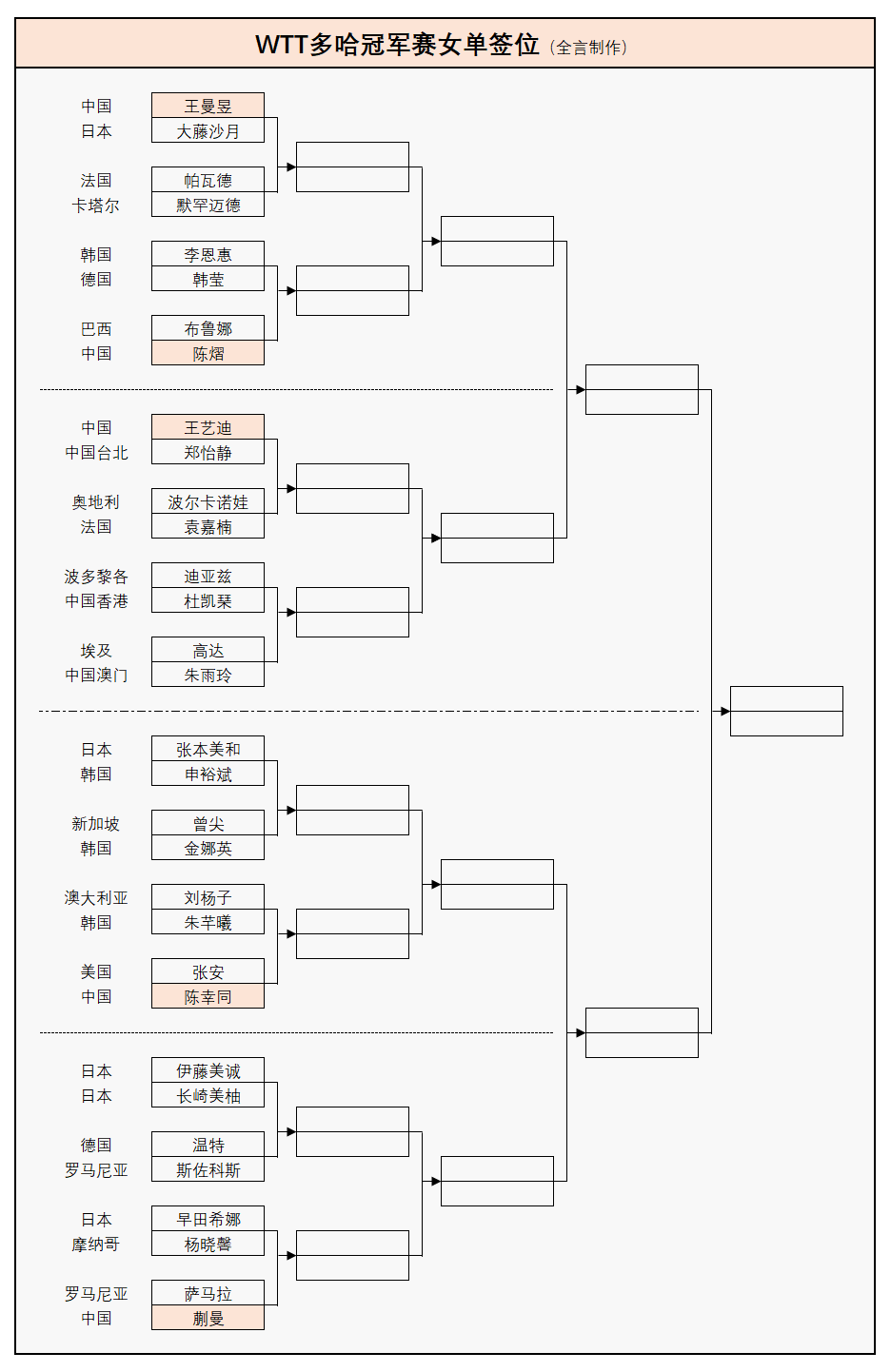 2026年1月7日,乒乓球WTT多哈冠军赛即将拉开帷幕,目前第一天的赛程已经出炉,中国队3大主力王艺迪、林诗栋、蒯曼将先后上阵,其余7位选手则被安排在1月8日登场;外协会方面,名将张本美和、伊藤美诚、勒布伦兄弟等人也将亮相,首轮或将爆发恶战,精彩值得关注!更多详情请看下文。