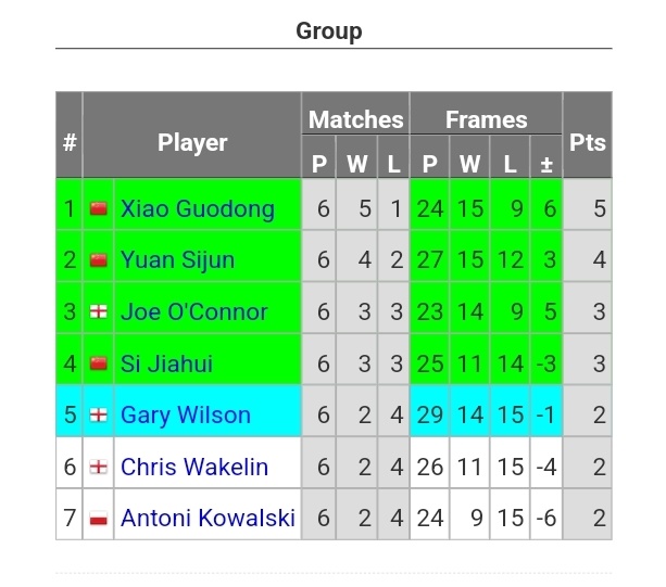 跻身小组争冠附加赛的中国球员肖国栋,会同小组第五加里·威尔逊,落入第四组。