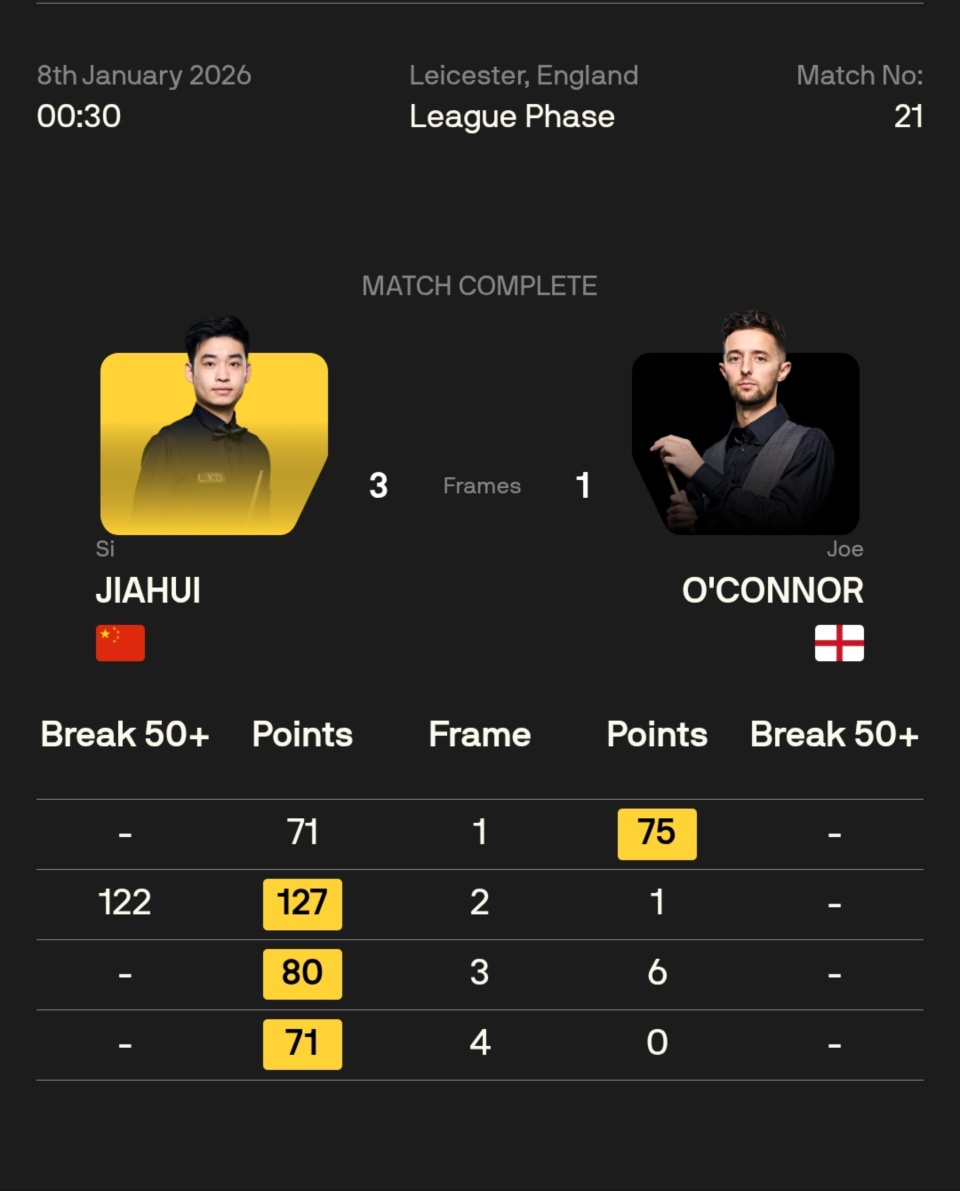 北京时间1月8日凌晨4时53分,2026斯诺克冠军联赛邀请赛版第三组第二比赛日,小组循环赛以及小组淘汰赛两个阶段的12场争夺,全部分出了高下,首日垫底的斯佳辉,触底反弹,演出逆袭好戏,反转剧本,强势小组登顶夺冠,杀进胜者组。
