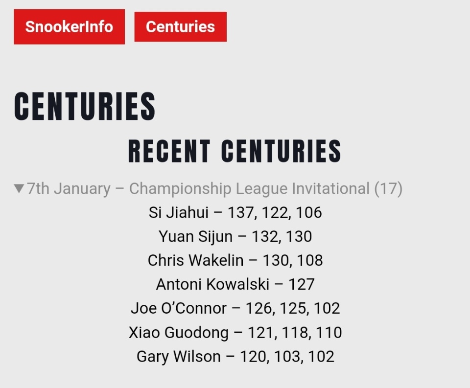 第三小组第二比赛日共打出17杆单杆过百,七位球员人人有份,其中四人打出三杆,两人打了两杆,小组24场比赛激战89局,轰出27杆破百,这效率也是没谁了。前两组比赛打出七杆的奥康纳,这一组就轰出七杆,三组14杆,本来严重威胁了杰克·琼斯32杆的单届赛事破百杆数纪录,但小乔退赛之后,琼斯基本可以高枕无忧了。