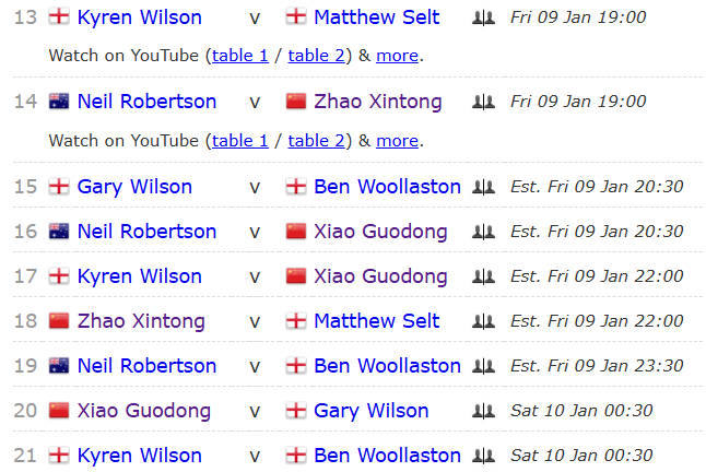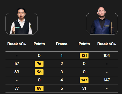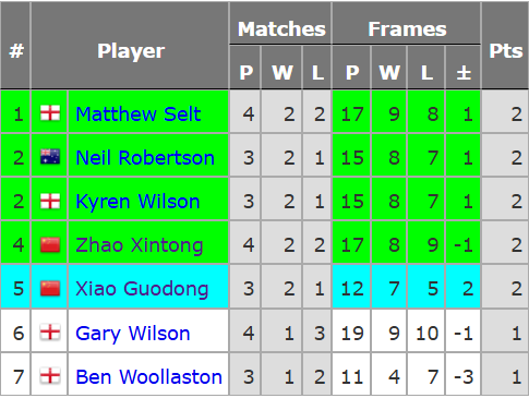 赵心童,4战2胜2负。首战囧哥,赵心童轰两破百(127、140),但2-3不敌囧哥凯伦·威尔逊。次战,赵心童被肖国栋零封。第3战,赵心童打出3杆70+,3-2胜的哥加里·威尔逊。第4战,赵心童打出3杆50+,3-1胜沃拉斯顿。