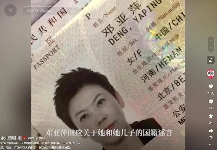邓亚萍实在没办法,2019年在社交平台晒出自己和儿子的证件,还说作为中国人而自豪,让黑粉闭嘴。