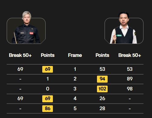 小组决赛,罗伯逊首局轰134分大号破百,但随后连丢3局,塞尔特3-1获胜。