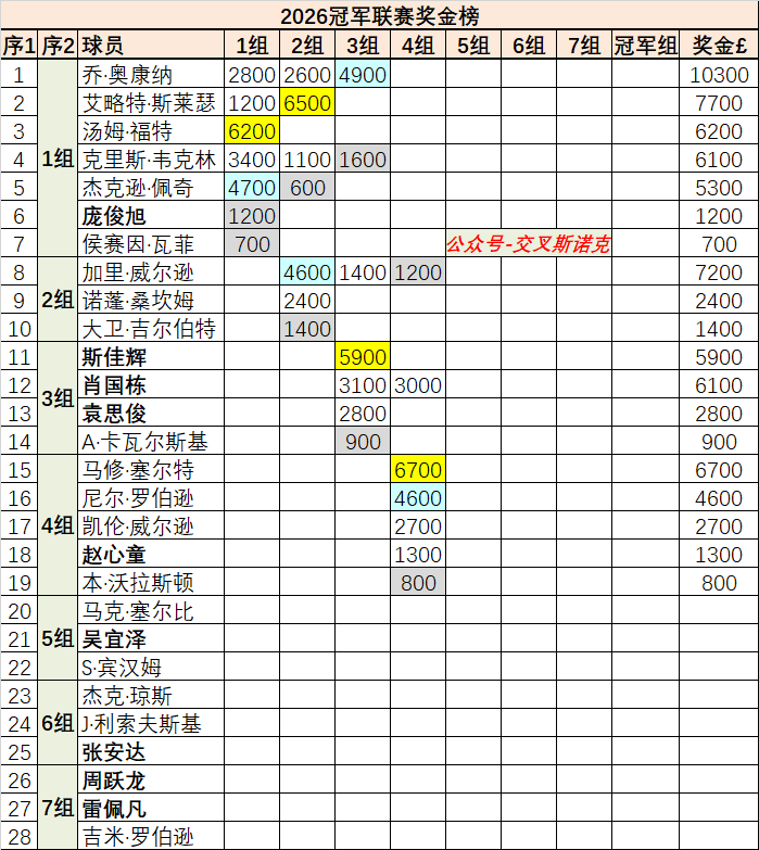 冠军联赛第一期比赛结束,第二期将在大师赛结束后继续,本月19日-24日将进行第5-7组的比赛。如果没有球员退赛,第5组的阵容是相当强大的,包括6位TOP16球员,囧哥威尔逊、罗伯逊、塞尔比、赵心童、肖国栋和吴宜泽,另外还有老将宾汉姆。