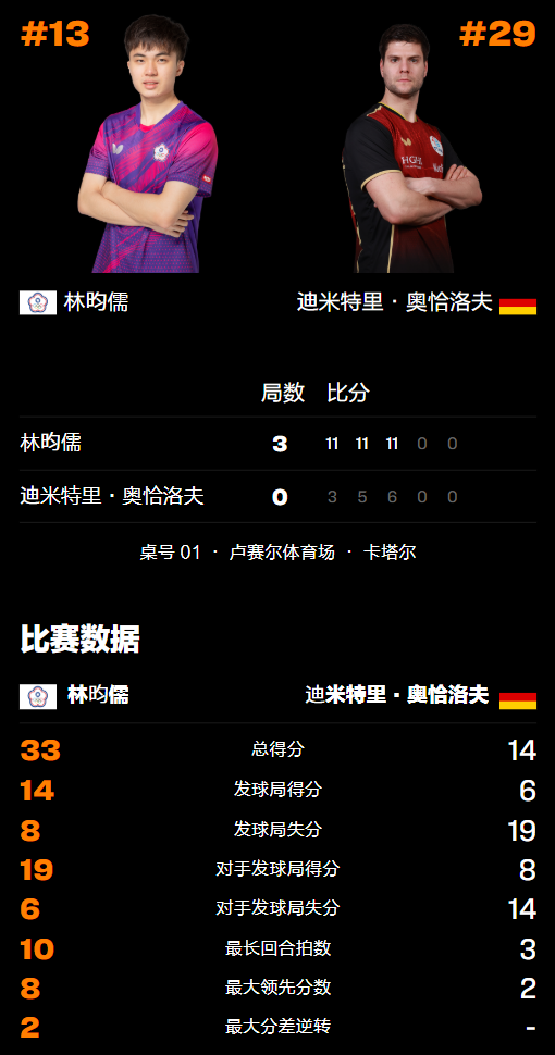 第三局林昀儒遭到背水一战的奥恰洛夫搏杀冲击,但依旧在开局阶段就取得优势,随后继续在中间段发力4-2领先逼对方叫出暂停进行调整,随后继续保持优势直至10-6拿到赛点,再得1分后以11-6结束战斗,由此而轻松晋级,而仅有的两位参加本站比赛的男单世界冠军便就此全军覆没被淘汰,的确竞争激烈。