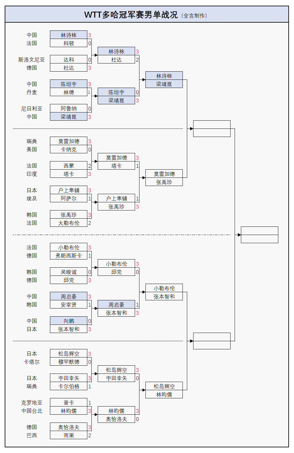 WTT多哈冠军赛:男单8强出炉!2位世界冠军败北,林昀儒大获全胜