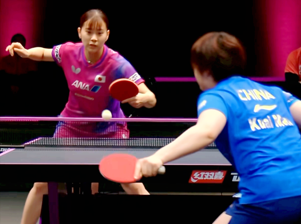 蒯曼出生于2004年,目前排名世界第3位;长崎美柚出生于2002年,最新排世界第15名——两人都是左手横拍、两面反胶弧圈球打法的运动员,赢球方式也是以速度为主,所以在技战术的使用上有许多相似之处。