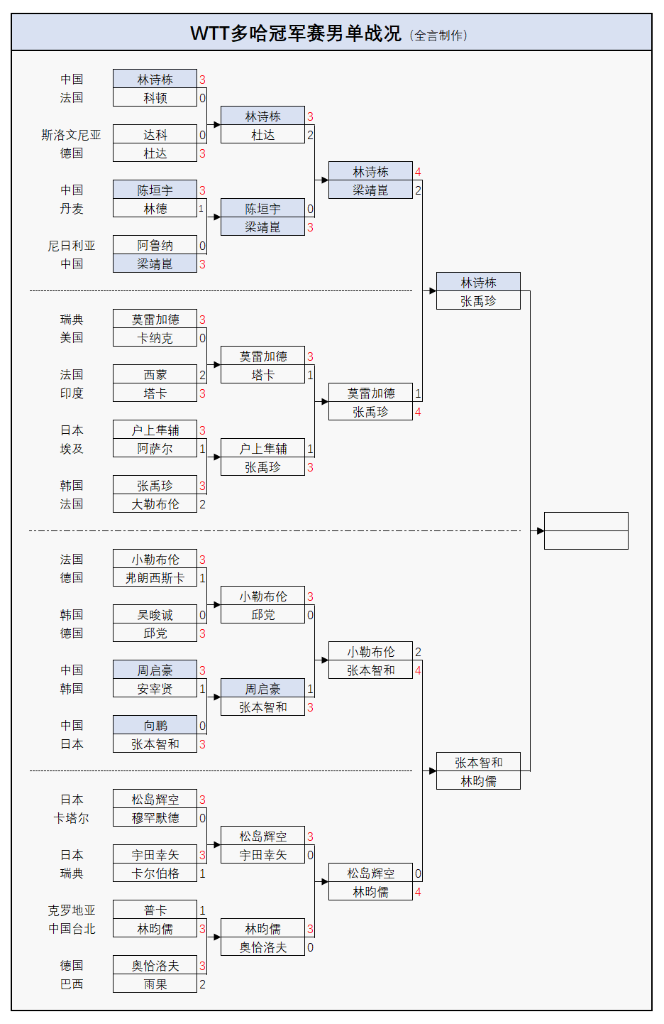 本次比赛国乒男单率先被突破,首轮向鹏0-3不敌日乒一哥张本智和,第二轮周启豪也1-3输给这位劲敌,另外还有两人在内战中败北,其中陈垣宇先以0-3输梁靖崑,紧接着梁靖崑又2-4不敌林诗栋,后者由此而成为中国队在该项目上的最后“独苗”,接下来将迎战韩国名将张禹珍,张本智和则会在半决赛中对决中国台北的林昀儒,晋级形势如下: