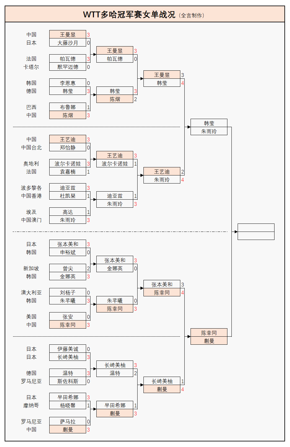 至于国乒女单的防线原本被许多人视为固若金汤,因为去年已经多次包揽国际赛事4强,结果目前输外战的人数比男单还多,其中陈熠2-3不敌德国削球老将韩莹后、王曼昱也3-4败给这位对手,至于王艺迪则是2-4输中国澳门主力朱雨玲(前国乒世界冠军),目前蒯曼、陈幸同已经连赢日本选手会师半决赛,韩莹则会与朱雨玲争夺另一张决赛门票,详细战况如下: