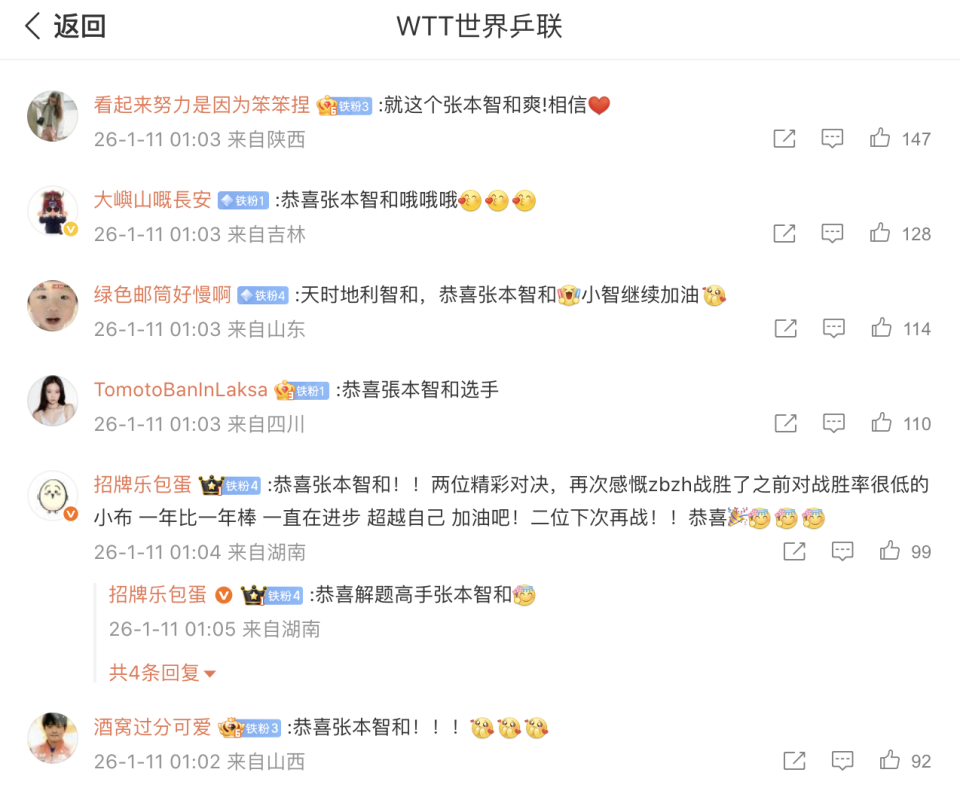 北京时间1月11日凌晨,WTT多哈冠军赛,张本智和4-2击败克星菲利克斯-勒布伦,强势晋级半决赛,有望再次夺冠。赛后,在WTT的官博留言区,大量中国网友留言恭喜张本智和。