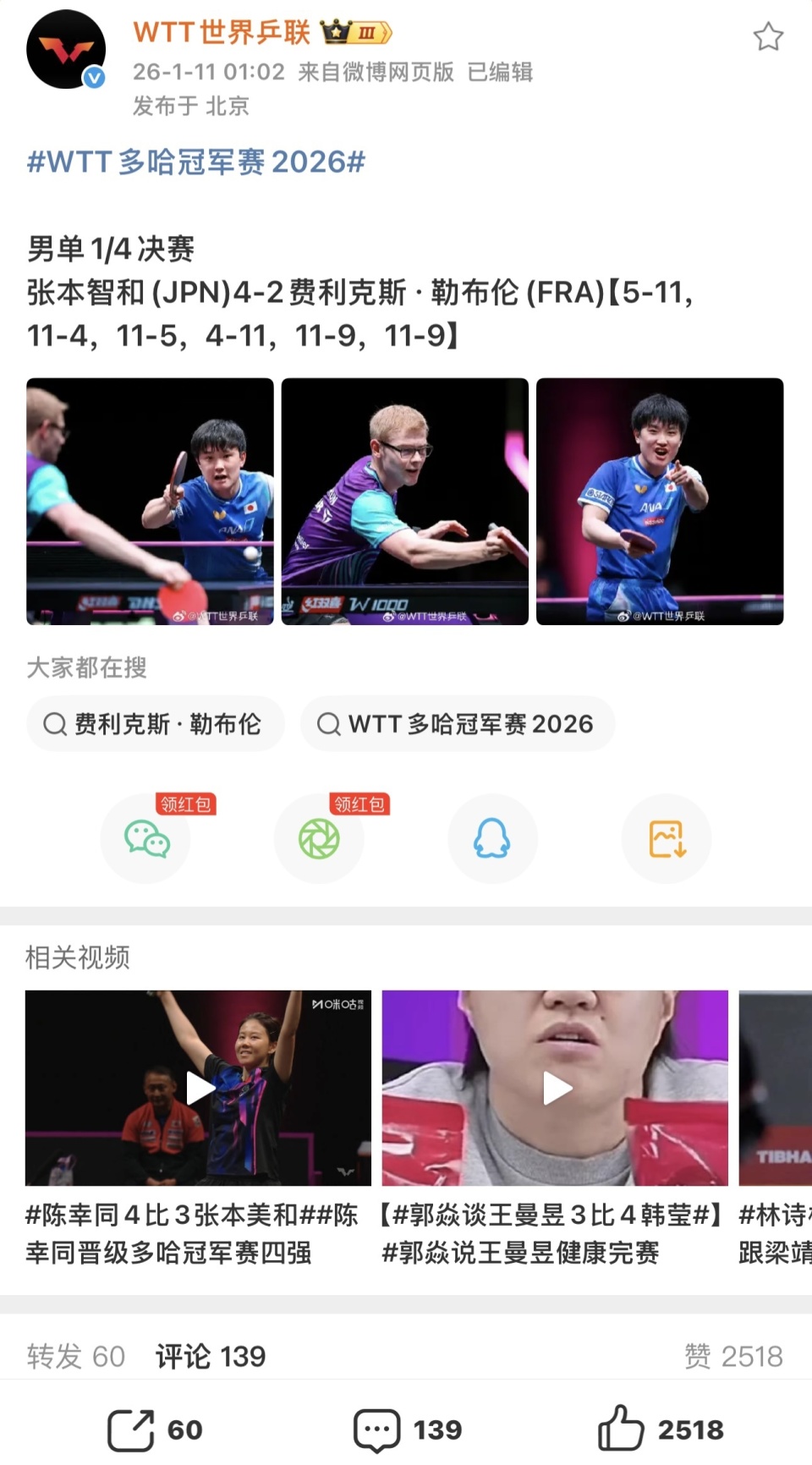 北京时间1月11日,WTT多哈冠军赛男单1/4决赛,张本智和4-2战胜菲利克斯-勒布伦,成功晋级四强,引起热议。