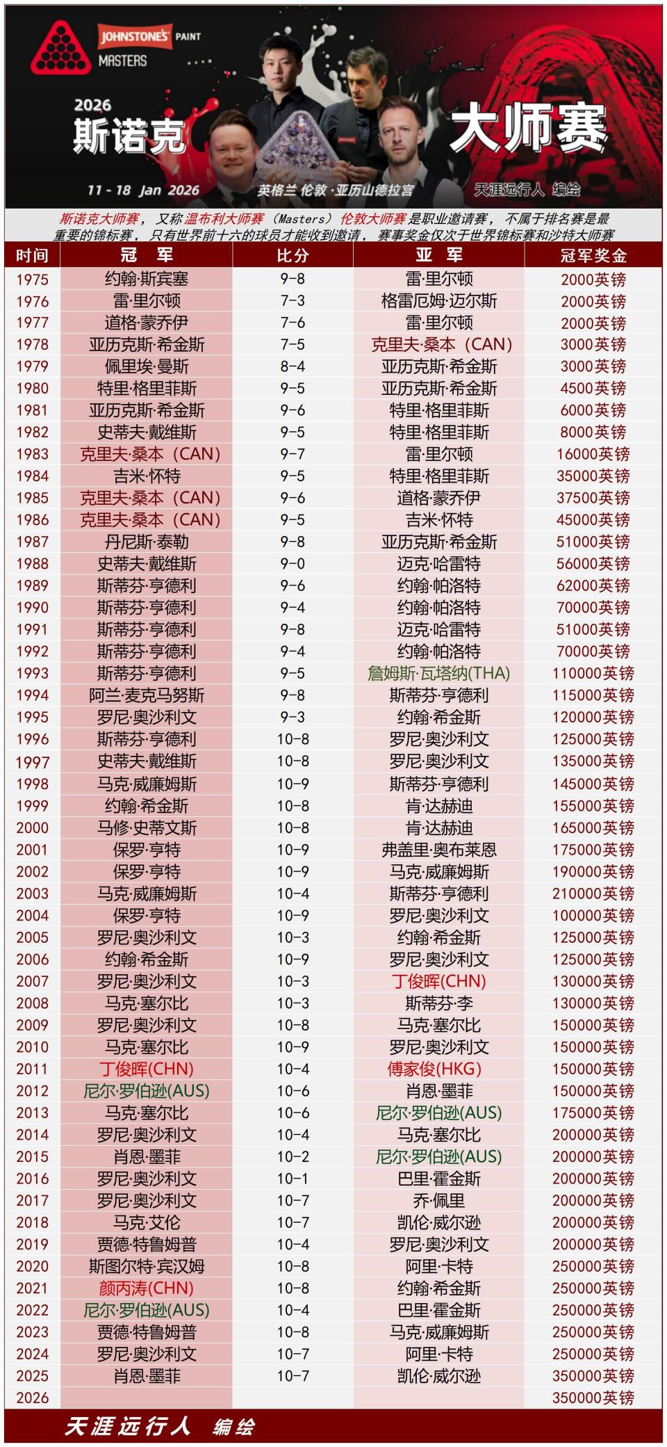 斯诺克大师赛那些事,最新完整签表、赛程观战指南,历届冠亚军榜