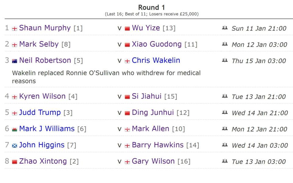 首轮的八场比赛,没有中国德比,也没有英格兰德比,全部为外战。赛会的二号种子、新科世锦赛冠军赵心童,首轮对阵加里·威尔逊,而其他的四位中国球员,按照排名对上的都是高排位大咖,均为赛会的前八号种子球员。