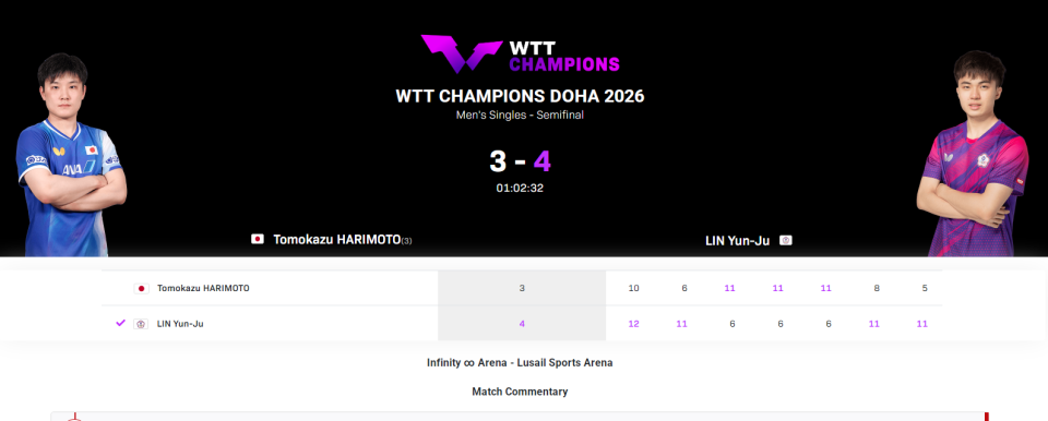 北京时间1月11日,WTT冠军赛多哈站男单半决赛,日本的张本智和对阵男单世界排名第13位的中国台北球员林昀儒,张本智和在连丢前两局的情况下,一度将以3-2反超局分,但最终还是3-4(10-12、6-11、11-6、11-6、11-6、8-11、5-11)输掉比赛止步四强。另一场半决赛,林诗栋2-4不敌韩国的张禹珍,林昀儒将与张禹珍争夺男单冠军。