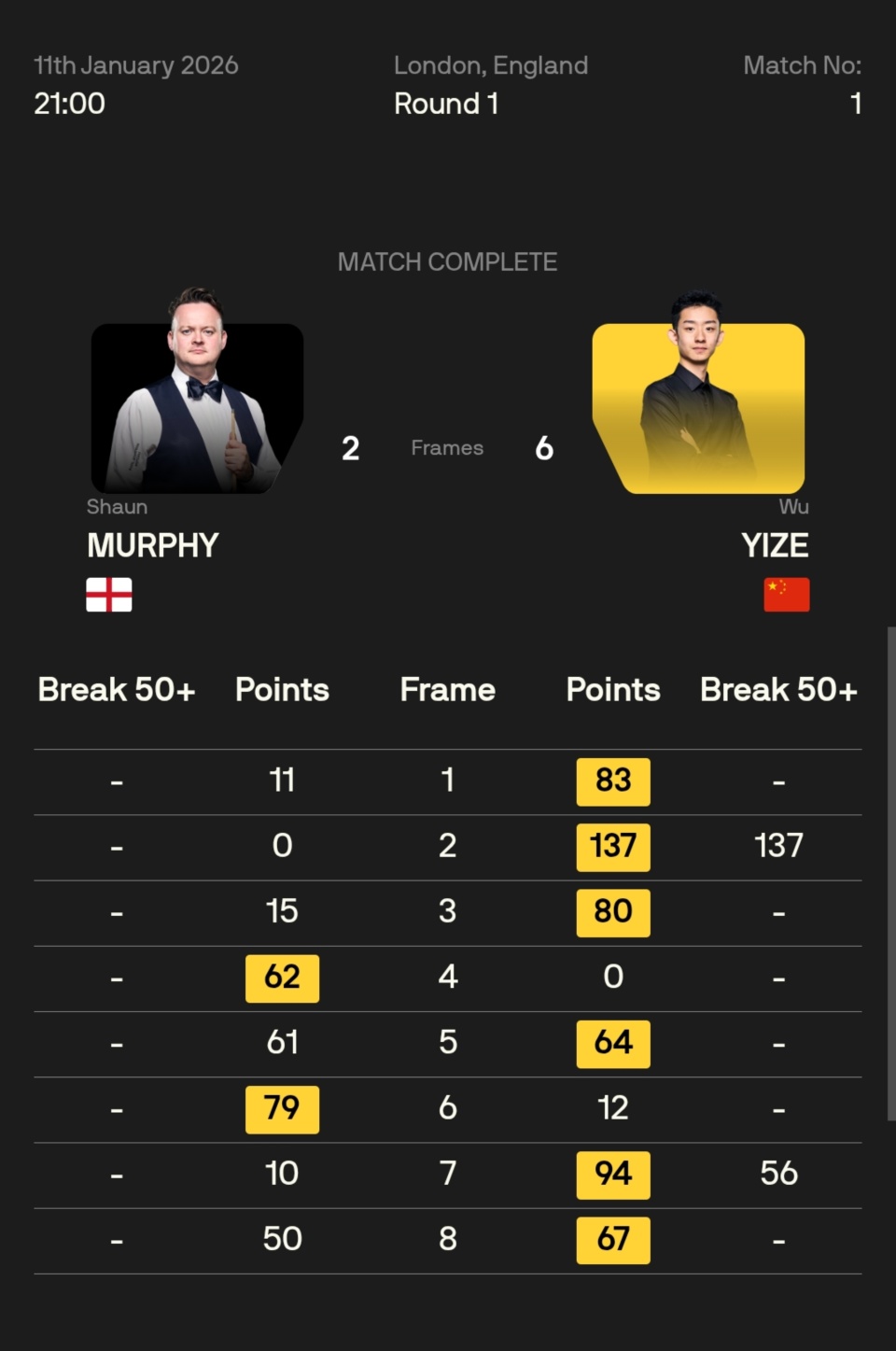 比赛开杆,吴宜泽先声夺人,在第二局中打出单杆137分,一波三连鞭连胜三局,建立3-0的领先;第四局,墨菲缠斗中获胜,两人进入短暂的局休。